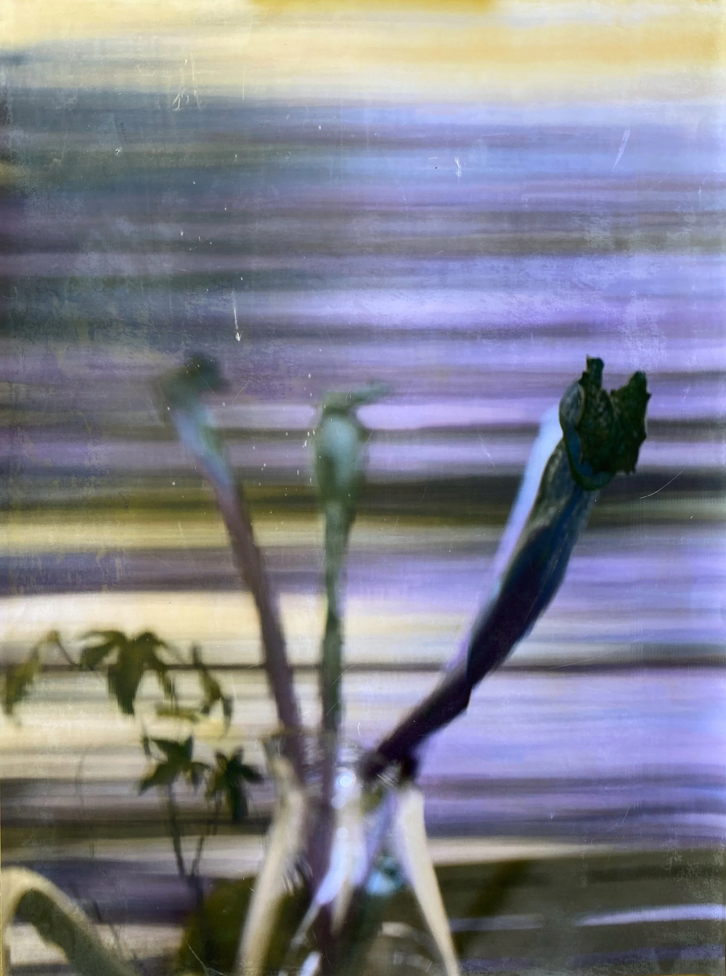 Alabama canebrake pitchers in a vase II (pale violet version), scanography, wax, pigments and oil on paper, w 20.5 x h 28.5 inches